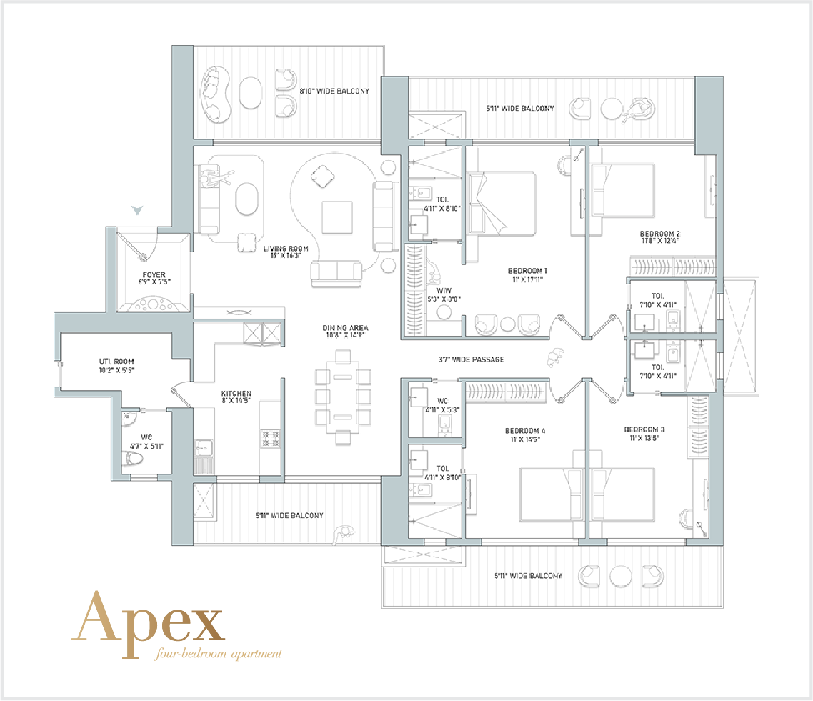 Designed to cater to the tastes of the discerning, Apex is a four-bedroom residence that reimagines urban living. With its expansive interiors, impeccable finishes, and state-of-the-art appliances, this home seamlessly combines functionality, style, and comfort. The apartment includes a large open-plan living area, a beautifully designed kitchen, and four exquisite bedrooms, each with a luxurious en-suite bathroom.