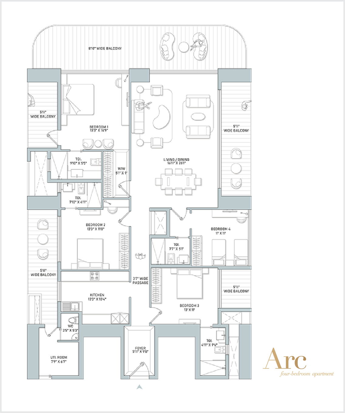 Specially crafted for those who appreciate refined living, Arc is a four-bedroom masterpiece that embodies urban sophistication. Designed with expansive interiors, premium finishes, and top-of-the line appliances, this residence offers a seamless blend of style and comfort. The apartment includes a large open-plan living area, a beautifully designed kitchen, and four exquisite bedrooms, each with a luxurious en-suite bathroom.