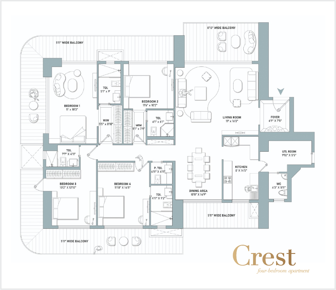 The four-bedroom residence, Crest, epitomises urban luxury. Featuring spacious interiors with the highest quality finishes and appliances, this residence offers a blend of modern elegance and comfort. The apartment includes a large open-plan living area, a beautifully designed kitchen, and four exquisite bedrooms, each with a luxurious en-suite bathroom.